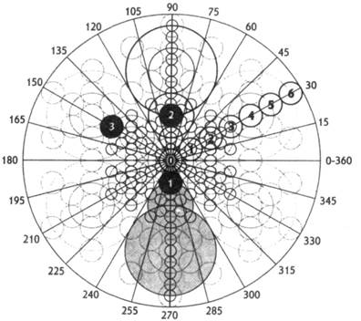 Рис. 10-41. Темные круги показывают 60-градусный угол, а линии, бегущие из центра Плода Жизни, - 30-градусные углы Рис. 10-42. Круги между 75 и 105 градусами сверху колеса также показывают угол в 30 градусов Внизу и вверху 60-градусной дуги на рисунке 10-41 вы видите круги, точно определяющие эту дугу. Если затем к центру каждой дуги через центр каждой фигуры Плода Жизни провести линии, то вы придете к следующим шести вторичным делениям, в результате чего колесо разделится на 30-градусные сектора. Так, внешний круг делится на 12 частей и, конечно, является тем колесом, которое древние египтяне использовали в храме Дендера для определения астрологических схем, деления небес на сектора и группирования звездных скоплений. На рисунке 10-42 - продолжение, где темные круги верхней 60-градусной дуги устанавливают дуги по 15 градусов между 75 и 105 градусами по обеим сторонам от центральной линии в 90 градусов. В верхнюю 60-градусную дугу точно вставлены две 15-градусные дуги, делящие внешнее колесо ровно на 24 сектора - именно та геометрия, что найдена на потолках гробниц в Египте. Поскольку колеса с 24 делениями были расположены на потолках рядом с пятиконечными звездами, олицетворяющими звезды небесные, то их единственный смысл в том, что они были связаны с астрологической схемой в Дендере, благодаря которой египтяне прокладывали свой путь в небеса. Еще одно доказательство этой идеи вы найдете на астрологической карте в Дендере (рис. 10-43). Посмотрите, снаружи «колеса» есть восемь мужских и четыре женских фигуры, поддерживающих его. Так представлены 12 секторов неба. У фигур 24 руки, фактически держащих колесо. Прямо внутри колеса находятся еще 36 фигурок. В этом образе в Дендере есть все три основные деления колеса: 12, 24 и 36. Изучив рисунок 10-44, вы увидите кое-что совершенно удивительное. Сначала рисунок кажется несколько запутанным, но затем он четко разворачивается. Взгляните на 30-градусную линию и вы увидите семь кругов (начинающихся с нулевого), считая от центрального до номера 6. Белый круг номер 1 используется для установки шести делений по 60 градусов, белый круг номер 2 - задает 30-градусную дугу внешнего колеса с 24 деления-