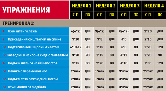 В первые 8 недель сделаем акцент на развитие силы, которая, во-первых, позволит сделать последующие тренировочные периоды более эффективными, увеличив в них рабочие веса, а во-вторых, заметно добавит мышц, начиная уже со второй недели. Вот основные принципы этой программы. КЛАСТЕРНЫЙ СЕТ. Подходы в ключевых упражнениях будут состоять из нескольких мини-подходов. Если в программе написано 3(4*2), ты действуешь так: выставив на штангу рабочий вес, делаешь 2 повтора, возвращаешь штангу на стойки, отсчитываешь 10-15 секунд, вновь снимаешь штангу со стоек и опять делаешь 2 повтора. Так четыре раза, после чего подход будет считаться законченным. Отдохнув предписанное количество минут, повтори все сначала еще дважды, пока не получишь 3 подхода. ИНТЕНСИВНОСТЬ. Ты будешь тренироваться 3 раза в неделю, например в понедельник, среду и пятницу. Каждая тренировка будет состоять из двух частей: первая силовая, вторая кондиционная — почти полностью состоящая из упражнений с собственным весом. Задача кондиционной части — поддержка выносливости, работа над координацией и балансом, чтобы в процессе набора массы ты не превратился в тяжело пыхтящую машину по медленной переноске собственного тела в пространстве. ПО КРУГУ. В таблице ты найдешь 4 распланированные по нагрузкам недели, этот курс надо будет пройти дважды. Проходя программу во второй раз, увеличь все рабочие веса, но не меняй упражнения даже на подобные им — мы работаем над увеличением силы, а для выполнения задачи упражнения должны быть неизменными весь период. РАБОЧИЕ ВЕСА. Самое главное в таблице — планирование количества и интенсивности кластерных сетов. Начать первую неделю надо с веса, который ты поднимаешь в конкретном упражнении на 6-7 повторов. Допустим, вес в жиме лежа на 6-7 повторов у тебя 80 кг. Первая неделя — жми 4(4*2) с весом 80 кг. Вторая неделя — подходов меньше, значит, вес снаряда можно увеличить. Например, так: 3(4*2) с весом 85-90 кг. Третья неделя — увеличение объема, подходов становится больше. Поэтому оптимальной здесь будет попытка выполнить все шесть подходов с тем весом, который ты использовал на первой неделе, — то есть 6(4*2) с весом 80 кг, что фактически будет означать увеличение нагрузки в полтора раза. Задача четвертой (и восьмой, соответственно) недели — разгрузка, рекордов не ставь, просто сделай два относительно легких подхода (50-65 кг) на 20 повторов. Во всех остальных упражнениях рабочий вес подбирается под заданное количество повторов: чем их больше, тем меньше рабочий вес. Плюс ко всему, чем проще упражнение, тем ближе к мышечному отказу можно подбираться в каждом сете. ЧЕРЕДОВАНИЕ ПОДХОДОВ. Упражнения, объединенные как 1А и 1В или 4А, 4В и 4C, означают, что тебе надо будет последовательно и по порядку выполнять подходы всех упражнений, объединенных в пары или тройки. Например, сделав подход упражнения 4А, отдохни и перейди к упражнению 4В. Вновь отдохни и сделай подход упражнения 4С. После отдыха вернись к началу — и так далее. КАК НАЧАТЬ ТОМУ, КТО ТОЛЬКО НАЧИНАЕТ?