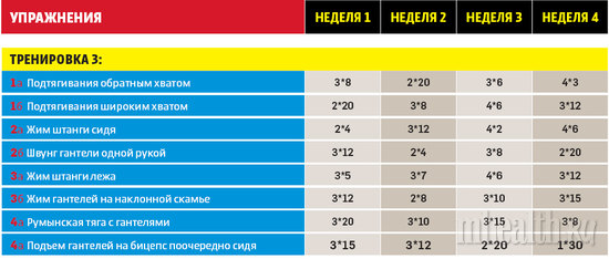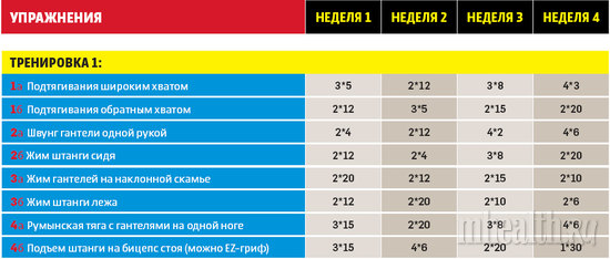 Ты будешь тренироваться по 4 раза каждые семь дней, объединяя тренировки в пары: например, «Тренировка 1» — понедельник, «Тренировка 2» — вторник, «Тренировка 3» — четверг, «Тренировка 4» — пятница. Тренировки 1 и 3, а также тренировки 2 и 4 похожи друг на друга, и иногда (в зависимости от тренировочной недели) будут отличаться только последовательностью выполнения упражнений. Рабочий вес в каждом упражнении подбирается под заданное количество повторов: чем меньше повторов, тем больше вес. Темп выполнения всех упражнений нормальный — 1 сек. на подъем веса, 2-3 — на опускание. Паузы отдыха между всеми подходами — до полного восстановления. Упражнения, объединенные в один блок (как 1А и 1Б), предполагают чередование подходов: подход упражнения 1А, отдых, подход 1Б, отдых, возврат к 1А. По тому же принципу надо поступать, когда в одну группу объединены 3 упражнения (например, 7А, 7Б и 7В), просто цикл будет состоят из 3, а не из 2 подходов. После окончания первого периода, описанного в февральском номере, можешь сразу приступать ко второму. Он рассчитан на 1 месяц.