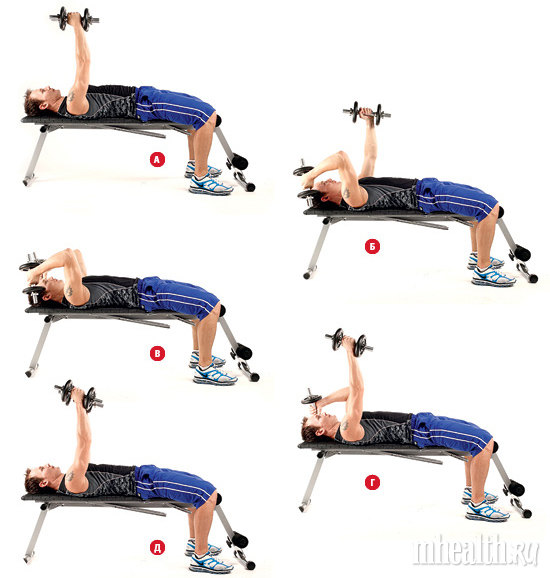 Ляг на лавку, подняв руки с гантелями над собой. Ладони разверни друг к другу, руки чуть согни в локтях (А). Сгибая правую руку в локте, опусти гантель к плечу, но не расслабляй трицепс (Б). Теперь аналогичным образом опусти вниз левую руку (В). Выпрями правую руку (Г), после чего выпрями левую (Д). Это будет считаться за один повтор. Сделай нужное количество повторов.
