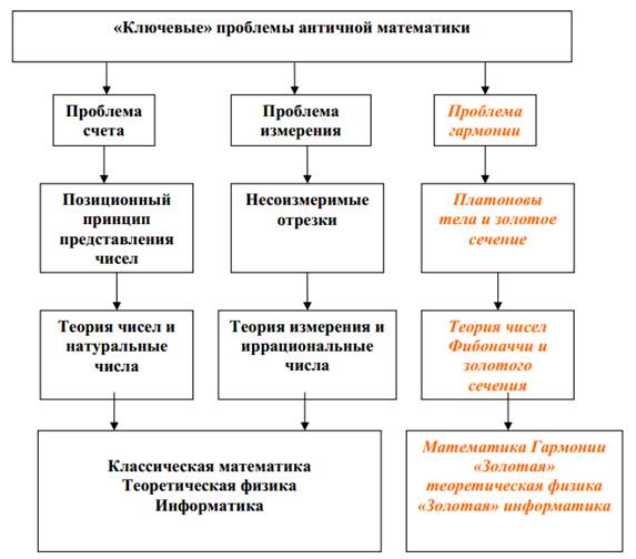 Рисунок 2. «Ключевые» проблемы античной математики и новый взгляд на пути развития математики, начиная с Евклида Значительная часть Начал посвящена изложению теории иррациональностей, восходящей к несоизмеримым отрезкам и основанной на «методе исчерпывания » Евдокса. В Книге V излагается общая теория отношений величин, созданная Евдоксом; её можно рассматривать как прообраз теории действительных чисел, разработанной только во 2-й половине 19 в. Общая теория отношений является основой учения о подобии (Книга VI) и метода исчерпывания (Книга VII), также восходящих к Евдоксу. В Книгах VII—IX изложены начала теории чисел. В эти книги входят: алгоритм Евклида и теория делимости, включая теоремы об однозначности разложения целого числа на простые множители и о бесконечности числа простых чисел; здесь излагается также учение об отношении целых чисел, эквивалентное, по существу, теории рациональных (положительных) чисел. В Книге Х даётся классификация квадратичных и биквадратичных иррациональностей и обосновываются некоторые правила их преобразования. Результаты Книги Х применяются в Книге XIII для нахождения длин рёбер правильных многогранников. Значительная часть Книг Х и XIII (вероятно и VII) принадлежит Теэтету (начало 4 в. до н. э.). В Книге XI излагаются основы стереометрии. В Книге XII определяются с помощью метода исчерпывания отношение площадей двух кругов и отношение объёмов пирамиды и призмы, конуса и цилиндра. Эти теоремы впервые доказаны Евдоксом. Наконец, в Книге XIII определяется отношение объёмов двух шаров, строятся пять правильных многогранников и доказывается, что иных правильных тел не существует. Из проведенного анализа можно сделать следующие выводы, касающиеся роли фундаментальных понятий и теорий математики, изложенных в Началах: 1. Первый вывод состоит в том, что в Началах Евклида впервые изложены основы теории чисел, к которой восходит современная теория чисел. Эта теория основана на следующем определении натурального числа, введенного Евклидом: