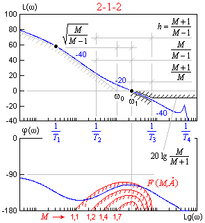 Формировать ВЧ участок ЛАЧХ удобно при использовании показателя колебательности M, линии уровня которого, при скольжении вектора A, с фазой j по окружностям M, можно нанести на ЛФЧХ. В качестве типовых в НЧ части используются ЛАЧХ с наклоном не более -40 дБ/дек, которому соответствует нулевой запас по фазе, поэтому необходимо в области частоты среза формировать участок с наклоном -20 дБ/дек, т.е. сводить типовые ЛАЧХ к одному из 2-х видов: