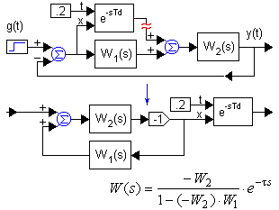 Большинство методов исследования устойчивости или качества систем в качестве входной информации используют ПФ системы для разомкнутого состояния W (s). Звено чистого запаздывания является нелинейным элементом, и затрудняет как аналитический анализ систем, так и машинный (программы математического моделирования не могут выполнять функции анализа для систем с нелинейными элементами). Поэтому либо используют линеаризованные аппроксиматоры звена чистого запаздывания, либо размыкают систему в той ветви, которая содержит звено чистого запаздывания, дабы ПФ имела вид: W (s) = W o(s) ´ e -t s , где W o(s) - ПФ части системы без запаздывания. Рассмотрим и разомкнем системы с основными вариантами включения звена чистого запаздывания - последовательным, параллельным и в цепи ОС: