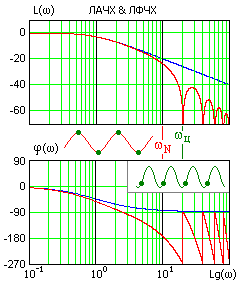 Теперь для формального перехода в область псевдочастот l (минуя промежуточные z и v-преобразования) достаточно подставить в ПФ W o(s)НЧ вместо s j l и умножить ее на множитель (1- j l T ц/2), для низких частот приближенно равный 1. А ПФ W o(s)ВЧ будет соответствовать выражение:
