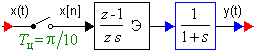 Изображенный дискретный фильтр имеет в области частот w ЛАЧХ & ЛФЧХ, использовать которые при синтезе неудобно. Перевод с помощью v-преобразования ЧХ в область псевдочастот l, позволяет получить ЛАЧХ, которые по виду подобны ЛАЧХ непрерывных систем. Последовательность преобразований следующая: W э(s)× W (s) ® W (z) ® W (v) ® W (j l T ц/2). Эти преобразования при использовании экстраполятора нулевого порядка могут быть формализованы. Пусть ПФ непрерывной части имеет вид: