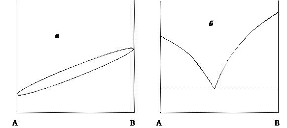 Рис. 3.3. Диаграмма плавкости для изоморфной (а) и неизоморфной (б) системы или образуется идеальный раствор, теплота растворения сплава в растворителе, DHA,B будет равна сумме теплот растворения компонентов DHA + DHB. Различие в DHA,B и (DHA + DHB) показывает, что сплав представляет собой твёрдый неидеальный раствор. Определить теплоту образования твёрдого раствора из твёрдых компонентов непосредственным измерением весьма трудно, так как этот процесс при комнатной температуре протекает очень медленно. Поэтому задачу решают косвенным путём, определяя DHA,B и затем теплоты растворения компонентов в том же растворителе по отдельности (DHA и DHB). Теплота образования одного моля твёрдого раствора вычисляется согласно закону Гесса по уравнению: DH = (DHA + DHB) – DHA,B (14) Знак и величина теплоты растворения при образовании твёрдого раствора служит показателем того, как сильно меняются свойства компонентов в растворе в результате взаимодействия. Объектом калориметрического исследования является неидеальный твёрдый раствор KCl и KBr, друг в друге.