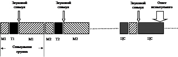 Рис. 14. Временная диаграмма процедуры обследования. М1, М2 – маскировочные стимулы (бессмысленные буквосочетания). Т1, Т2 – тестовые стимулы., ЦС – целевой стимул