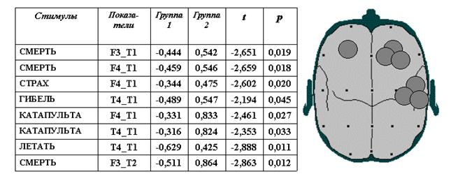 Согласно приведенной схеме обработки были получены оценки как бессмысленных, так и осмысленных стимулов для каждого отведения. Сравнение групп осмысленных и бессмысленных стимулов позволяет оценить степень вовлечения той или иной области мозга в процесс обработки семантической информации. На графике (рисунок 15) представлены значения критерия Стьюдента для каждой области мозга в зависимости от времени экспозиции, полученные при сравнении бессмысленных и осмысленных стимулов. Для наглядности те же данные представлены в виде карты, отражающей пространственное распределение этих показателей. Очевидно, что степень семантических различий во всех отведениях существенно выше при большем (Т2) времени экспозиции. Принципиально важным представляется характер соотношений анализируемых показателей в левом и правом полушариях. Если при малом времени экспозиции Т1 максимальная выраженность показателей отмечается в передних областях левого полушария, то при большом времени экспозиции Т2 максимальная выраженность показателей, отражающих степень семантических различий отмечается в задних отделах правого полушария. Мы полагаем, что данный факт отражает процесс семантического оценивания на неосознаваемом уровне, начиная от ядерных обобщенных отношений до чувственно-окрашенных, перцептивно-насыщенных образований.