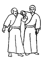 Опыт 3. А стоит, держа внимание на единой точке и полностью расслабившись. Б хватает его одной рукой за запястье и пытается поднять руку А (Рис. 6.3). До тех пор, пока А держит внимание на единой точке, он сохраняет устойчивость: Б не может поднять его руку. Это и есть настоящее расслабление. Удерживание внимания на единой точке и полное расслабление - совершенно эквивалентные действия. Их нельзя разделить. Опыт 4. А расслабился, но концентрирует своё внимание на верхней части головы. Выглядит он так же, как и в предыдущем случае (Рис. 6.3). Б опять хватает его руку и толкает вверх. На этот раз рука легко поддаётся (Рис. 6.4). Это не расслабление, а потеря энергии. Расслабление - это самое сильное состояние, потеря энергии - самое слабое. Всё дело в том, что они выглядят почти совсем одинаково. Именно поэтому истинная природа расслабления так часто понимается неправильно. Великие люди в состоянии опасности, как правило, остаются спокойными и расслабленными. Они достигают способности полного расслабления благодаря обучению, пробам и ошибкам или посредством травматического опыта. И для вас ещё не поздно этому научиться - без всяких травм. Удерживайте внимание на единой точке и поддерживайте настоящее расслабление - и величие придёт к вам само.