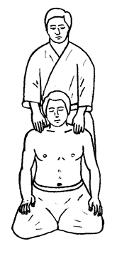 Даже самый хороший водитель не застрахован от удара сзади другой машины. А внезапный резкий удар приводит к травме шеи. Травма шеи может свести на нет самую яркую жизнь, заставив пострадавшего потерять надежду на выздоровление. Те же страдания приносят мигрени. Временно боль можно снять с помощью лекарств. Но после окончания срока действия лекарства страдания возобновляются. Но травму шеи и мигрень можно вылечить с помощью киацу. Киацу кажется подобным сиацу (лечению с помощью надавливания пальцами), но эта техника имеет свои фундаментальные отличия. Сиацу включает физическое воздействие на поражённые части тела или органы. Задача киацу состоит в направлении Ки в поражённые области и активации жизненной силы. Когда старый насос перестаёт подавать воду, вы заливаете небольшое количество воды для заправки и начинаете работать рукояткой. Как только начнёт течь вода, насос сам продолжит свою работу. То же можно сказать о жизненной силе. Травма шеи ослабляет жизненную силу в шее, и человек, перенёсший травму, не может сам её восстановить. В таком случае пошлите Ки из кончиков своих пальцев в пострадавшую область и приведите в действие жизненную энергию. Напряжённые мышцы расслабятся, жёсткость исчезнет, шея опять станет гибкой и подвижной. Когда активизируется жизненная сила, пациент выздоровеет. Как же распространить Ки из своих пальцев? К. Тохэй объясняет нам это настолько подробно, чтобы это было под силу даже начинающему. Упражнение 1. А вытягивает руку вперёд и думает о том, как по ней проходит Ки. Б пытается согнуть руку, но безуспешно (Рис. 6.24). Это та самая несгибаемая рука, которая использовалась в качестве примера при объяснении четвёртого из Четырёх основных принципов объединения ума и тела: "Расширьте свою Ки. " Ки расширяется, когда вы верите в то, что это так. Упражнение 2. А отводит большой палец правой руки, слегка согнув внутрь. Б, надавив ладонью, возвращает его на место. Если А будет посылать из кончика своего пальца Ки. Б не сможет вернуть его обратно. Если А направляет силу в свою руку или большой палец, Б будет не способен отогнуть палец обратно (Рис. 6.25). Это несгибаемый палец. Когда вода извергается из шланга, самое большое давление образуется у его выходного отверстия. Подобным образом, если вы концентрируете своё внимание на кончике пальца, Ки выходит за его пределы. Когда А сосредоточивает свою Ки на кончике пальца и палец оказывается против ладони Б, Ки естественно выходит за его пределы, и палец невозможно вернуть обратно. Именно таким образом расширяется Ки с помощью киацу. Всё, что делается с помощью пальцев, можно использовать для работы с помощью техники киацу. Опыт 3. Б сидит в позе сэйдза или со скрещенными ногами. А стоит за ним, держа большие пальцы рук на плечах Б, в точках, которые находятся как раз под ушами (Рис. 6.27). Сначала он начинает постепенно надавливать пальцами, пока не исчезнет зазор. Потом, не усиливая давления, он посылает свою Ки. Если Б чувствует, как принадлежащая А Ки проникает через плечо в его тело, значит А делает киацу правильно. Если А будет просто давить с силой, Б будет испытывать неприятную боль. При проникновении Ки он испытывает своего рода приятную боль. Проводя сеанс киацу, А всё время должен интересоваться, что при этом чувствует Б. Далее К. Тохэй объясняет на какие области следует
