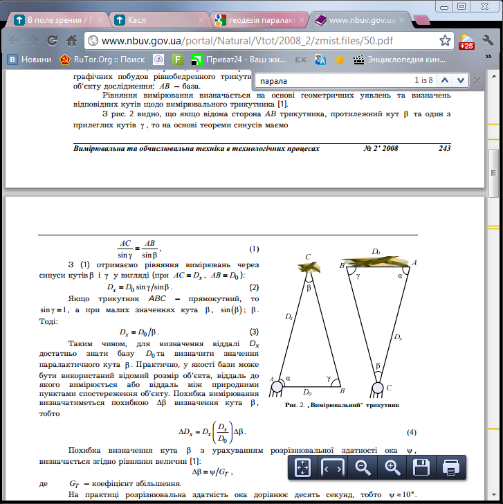 44. Вимірювання та обробка ліній БП-2 Вимір ліній інварними дротами можна виконувати або способом відліків або способом фіксації. Базисні прилади БП – 2 призначені для виміру ліній способом відліків. По виміру лінії можна розділити окремі операції: вішення і розставляння штативів, вимір відстані, нівеляція штативів. Вішення виконується за допомогою теодоліта; воно робиться для точного розставляння штативів в створі між центрами, закладеними на кінцях вимірюваної лінії Вимір лінії полягає в точному і послідовному вимірі інварними дротами довжини окремих прольотів між перетином сусідніх штрихів У створі лінії по обох сторонах першого прольоту встановлюють блокові верстати і за допомогою гирь натягують дріт, обидві шкали дроту при цьому повинні знаходитися на рівні голівці целіків. роблять відліки. після перших відліків дріт переміщають по створу лінії на декілька міліметрів і роблять другу Нівеляція штативів з робиться з метою приведення довжини кожного прольоту і залишку до горизонту. Спосіб фіксації при вимірі лінії цим способом штативи з целіками мають бути замінені на штативи з дерев'яними столиками або дерев'яними сегментами. 45. Вимірювання ліній паралактичним методом