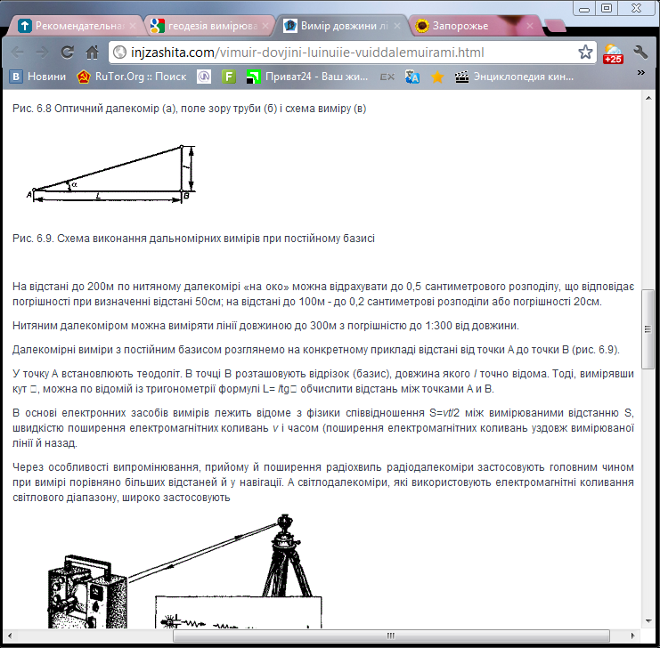 46. Вимірювання ліній оптичними віддалемірами Далекомірами називаються геодезичні прилади, за допомогою яких відстань між двома точками вимірюють непрямим способом. Далекоміри підрозділяють на оптичні й електронні. Оптичні далекоміри діляться на далекоміри з постійним паралактичним кутом і далекоміри з постійним базисом. Найпростіший оптичний далекомір з постійним кутом є в зорових трубах всіх геодезичних приладів. У поле зору труби приладу видні три горизонтальні нитки. Дві з них, розташовані симетрично щодо середньої нитки, називаються далекомірними. Нитяний далекомір застосовують у комплекті з нівелірною рейкою, розділеної на сантиметрові розподіли.Принцип вимірювання ліній оптичним віддалеміром полягає у визначенні відстані з прямокутного трикутника з відомим паралактичним кутом α та стороною. Для спрощення вимірювань одна із величин приймається за постійну, а інша вимірюється. Якщо кут постійний, а величина базису змінюється, то говорять, що це віддалемір з постійним паралактичним кутом і змінним базисом. Це найбільш розповсюджений тип оптичних віддалемірів, який застосовується в теодолітах і нівелірах і називається нитковим віддалеміром. Для вимірювання ліній на її кінцях встановлюють прилад і нівелірну рейку з сантиметровими поділками. При горизонтальному положенні візирної осі зорової труби промені від далекомірних ниток, пройшовши через об'єктив і передній фокус F, перетнуть рейку в точках А і В.Вимірявши кут α, можна обчислити відстань між точками АВ. Для вимірювання ліній на її кінцях встановлюють прилад і нівелірну рейку з сантиметровими поділками.