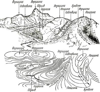 Рельеф – совокупность неровностей земной поверхности. Рельеф отображается на картах мелкого масштаба интенсивностью цвета, на крупномасштабных планах горизонталями, бергштрихами, абсолютными отметками. Горизонтали – это замкнутая кривая линия на плане, все точки которой на местности имеют одинаковые отметки. Кратчайшее расстояние между соседними горизонталями на плане называется – заложением. Вертикальное расстояние между соседними горизонталями на местности называется – высота сечение рельефа.