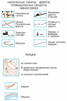 На прямой линии (рис.4.3) откладывают отрезки по 2 см (основание масштаба). Вверх по перпендикуляру откладывают на равном расстоянии 10 равных частей. Левая часть полученного прямоугольника делится 10 наклонными линиями (трансверсалями). Наименьшее деление поперечного масштаба (рис.4.4) равен 1/10 части левой шкалы. 5.Условные знаки, используемые при составлении топографических планов и карт Важнейшим показателем качества топографических карт и планов наряду с точностью является их наглядность. Она достигается применением условных знаков, с помощью которых на картах и планах изображаются ситуация и рельеф местности. Условные знаки, изображающие ситуацию местности, подразделяются на площадные, внемасштабные, линейные и пояснительные (рис. 18). Площадные, или масштабные, условные знаки служат для изображения объектов, занимающих значительную площадь и выражающихся в масштабе карты или плана. Площадной условный знак состоит из знака границы объекта и заполняющих его знаков или условной окраски. Контур объекта показывается точечным пунктиром (контур леса, луга, болота), сплошной линией (контур водоема, населенного пункта) или условным знаком соответствующей границы (канавы, изгороди). Заполняющие знаки располагаются внутри контура в определенном порядке (произвольно, в шахматном порядке, горизонтальными и вертикальными рядами). Площадные условные знаки позволяют не только найти расположение объекта, но и оценить его линейные размеры, площадь и очертания. Типы условных знаков Внемасштабными называются такие условные знаки, которыми предметы местности изображаются без соблюдения масштаба карты или плана (например, отдельное дерево, километровый столб, колодец и т. д.). Эти знаки не позволяют судить о размерах изображаемых местных предметов. Положению предмета на местности соответствует определенная точка знака (обычно в центре или в вершине прямого угла у основания знака). Следует учесть, что одни и те же местные предметы на картах или планах крупных масштабов могут быть выражены площадными (масштабными) условными знаками, а на картах мелких масштабов — внемасштабными условными знаками. Линейными условными знаками называются знаки, изображающие протяженные объекты на местности, например железные, автогужевые дороги, ручьи, границы и другие. Они занимают промежуточное положение между масштабными и внемасштабными условными знаками. Длина таких объектов выражается в масштабе карты, а ширина на карте — вне масштаба; обычно она получается больше ширины изображаемого объекта местности, а его положению соответствует продольная ось условного знака. Пояснительные условные знаки служат для дополнительной характеристики изображаемых на карте местных предметов, например: длина, ширина и грузоподъемность моста, ширина и характер покрытия дорог, средняя толщина и высота деревьев в лесу, глубина и характер грунта брода и т. д. Различные надписи и собственные названия объектов на картах также носят пояснительный характер; каждая из них выполняется установленным шрифтом и буквами определенного размера. Рельеф местности на топографических планах и картах изображается следующими методами: методами штрихов, отмывки, цветной пластики, отметок или горизонталей. На картах крупного масштаба и планах рельеф изображается, как правило, ме