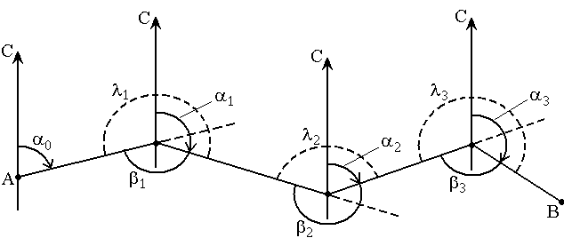 На рис. 25 представлена схема определения дирекционных углов сторон теодолитного хода AB. Известен дирекционный угол исходной стороны α0 и измерены геодезическим прибором теодолитом углы β1, β2, β3, лежащие справа по ходу от А к В.
