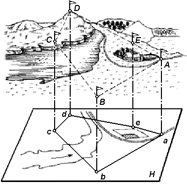 Рис. 26. Проектирование участка земной поверхности на горизонтальную плоскость План – чертеж, на котором в уменьшенном и подобном виде изображается горизонтальная проекция небольшого участка местности. Карта – уменьшенное и искаженное, вследствие влияния кривизны Земли, изображение горизонтальной проекции значительной части или всей земной поверхности, построенное по определенным математическим законам. Таким образом, и план, и карта – это уменьшенные изображения земной поверхности на плоскости. Различие между ними состоит в том, что при составлении карты проектирование производят с искажениями поверхности за счет влияния кривизны Земли, на плане изображение получают практически без искажений. В зависимости от назначения планы и карты могут быть контурные и топографические. На контурных планах и картах условными знаками изображают ситуацию, т.е. только контуры (очертания) горизонтальных проекций местных предметов (дорог, строений, пашен, лугов, лесов и т.п.). На топографических картах и планах кроме ситуации изображают ещё рельеф местности. Для проектирования железных, шоссейных дорог, каналов, трасс, водопроводов и других сооружений необходимо иметь вертикальный разрез или профиль местности. Профилем местности называется чертеж, на котором изображается в уменьшенном виде сечение вертикальной плоскостью поверхности Земли по заданному направлению. Как правило, разрез местности (рис. 27, а) представляет собой кривую линию ABC...G. На профиле (рис. 27, б) она строится в виде ломаной линии abc...g. Уровенную поверхность изображают прямой линией. Для большей наглядности вертикальные отрезки (высоты, превышения) делают крупнее, чем горизонтальные (расстояния между точками).