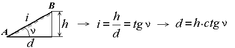 Рис. 31. Определение уклона и угла наклона ската Другой характеристикой крутизны служит уклон i. Уклоном линии местности называют отношение превышения к горизонтальному проложению. Из формулы следует (рис. 31), что уклон безразмерная величина. Его выражают в сотых долях (%) или тысячных долях – промиллях (‰). Если угол наклона ската до 45°, то он изображается горизонталями, если его крутизна более 45°, то рельеф обозначают специальными знаками. Например, обрыв показывается на планах и картах соответствующим условным знаком (рис. 32). Изображение основных форм рельефа горизонталями приведено на рис. 32.