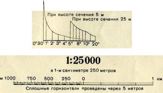Концы этих отрезков соединяют плавной кривой (см. рис. 36). Заложение линии, угол наклона которой надо определить, снимают с карты при помощи измерителя, а затем, укладывая на графике между основанием и кривой измеренный отрезок, находят соответствующее ему значение угла наклона.