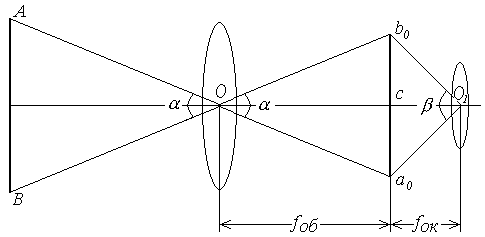 Рис. 45. Увеличение зрительной трубы При наблюдении на большие расстояния можно считать, что изображение предмета в трубе удалено как от объектива, так и от окуляра на величину их фокусных расстояний, т.е. Оc = foб, а cО1 = foк. Из треугольников a0O1b0 и a0Оb0 имеем
