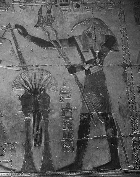 Рис. 6. Изображение бога Тота в храме Сети I (Абидос, Египет) Другой важный персонаж этой части ханаанской мифологии, с которого, собственно, все и началось, бог моря – Йамму (Йам). Йамму был первенцем и любимцем Эля/Илу. И верховный бог фактически потакал всем капризам Йамму. Так по приказу великого бога Илу бог-ремесленник Котару-ва-Хасису построил дворец для Йамму, а обладание дворцом служило важным условием для того, чтобы претендовать на власть. И чем богаче дворец, тем большей властью может обладать его владелец. По нашим представлениям, первенец обладает приоритетным правом наследования трона, так что Йамму рано или поздно должен был стать верховным правителем богов. Однако он по каким-то причинам решил форсировать смену власти. Согласно угаритским текстам, светоч богов, богиня солнца Шапашу, рассказала о строительстве дворца для Йамму богине Астарте и добавила, что отец богов, Бык Илу, возлюбил Йамму и в угоду ему «вырвет столбы жилища Астарты, опрокинет трон ее царствования, разобьет ее скипетр». Чем Астарта так прогневала Йамму, что он решил лишить ее своей части власти, из текста совершенно не ясно. Как не ясно и то, зачем богиня солнца Шапашу решила предупредить Астарту о нависшей над ней угрозе. Впрочем, не ясно, была ли вообще эта угроза, и не было ли это вообще простой провокацией со стороны Шапашу. Однако в Египте был найден папирус, относящийся к XVI-XIV веку до нашей эры и содержащий (предположительно финикийский) миф об Астарте и боге моря. Этот миф представляет произошедшие события в более понятном виде. Согласно тексту на египетском папирусе, бог моря Йамму решил, что он – самый великий из богов и все остальные боги должны платить ему дань. И боги испугались. Первой принесла Йамму дань богиня урожая Рененут, дала она ему серебро, золото, лазурит, ларцы, полные драгоценностей. За ней послали Йамму дань и другие боги. Но бог моря этим не удовлетворился. Испугались боги, что Йамму совсем разорит их, и стали думать, как с ним договориться. Решили они выбрать посредника. И выбор пал на Астарту. Рененут послала к ней птицу, повелев не возвращаться, пока та не уговорит Астарту помочь богам. Услышав просьбу богов, Астарта заплакала, сама испугавшись грозного бога моря. Но птица уговорила ее. И вот Астарта пришла туда, где заседали великие боги. Они стали просить ее пойти к Йамму, соблазнить его и вызвать у него любовь к ней. А затем уже попросить Йамму уменьшить дань. Астарта согласилась, отправилась к Йамму и довольно быстро добилась своей цели. Полюбив Астарту, Йамму решил женится на ней и отправил вестника к ее отцу с требованием отдать свою дочь за Йамму. Отец Астарты (в разных источниках в этом качестве фигурируют почему-то разные боги) обратился к другим великим богам и попросил совета. Боги посоветовали согласится на требование Йамму, но также передать богу моря, что он должен отказаться брать с них непосильную дань. Однако Йамму на это не согласился. И были вынуждены боги снимать свои драгоценности и отдавать их в качестве дани Йамму. Скорбели боги по этому поводу и не раз вступали в переговоры с Йамму. И тогда Астарта сказала, что не будет она женою бога моря, если тот будет настаивать на своих требованиях. И согласился Йамму. И наступил мир среди богов…