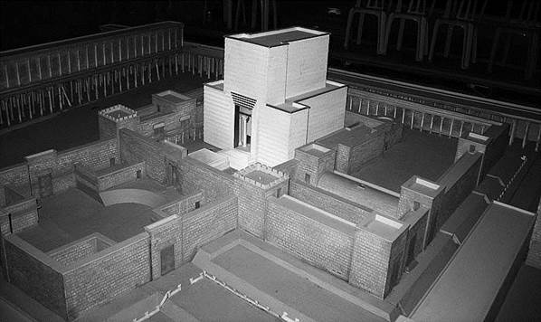 Рис. 28. Макет храма времен Ирода Великого Ныне на вершине Храмовой горы можно видеть всего два значительных сооружения. Одно из них – это знаменитая мечеть Аль-Акса, в которой во времена крестовых походов находилась штаб-квартира тамплиеров. Но главное сооружение располагается севернее Аль-Аксы. Это увенчанная золотым куполом мечеть под странным названием Купол Скалы (см. Рис. 7-ц). Именно здесь (а не на месте Аль-Аксы, как иногда ошибочно думают) ранее располагался храм Соломона. Почему Давид хотел построить храм единого бога именно на этой горе, для этого даже специально выкупив здесь гумно у некоего иевусея по имени Аравна (Орна) и возведя тут жертвенник?.. Почему Соломон выбрал именно это место на вершине горы?.. Думаю, что ответы на эти вопросы тесно связаны с одной странной особенностью мечети Купол Скалы, стоящей ныне здесь.