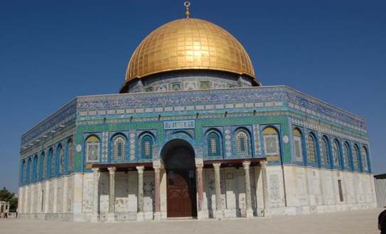 Мечеть Купол Скалы возведена вокруг небольшого скального выступа, который возвышается на 1,25-2 метра и имеет в длину 17,7 метров и в ширину 13,5 метров. Этот скальный выступ, согласно преданию, связан с широко известным библейским текстом. Именно здесь Авраам готовил жертвенный костер для того, чтобы принести Богу в жертву своего сына. Однако ангел отвел его руку и сообщил ему согласие Бога принять в жертву ягненка вместо отрока (см. Рис. 8-ц).