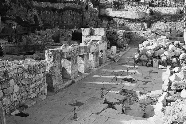 Рис. 41. Мостовая, датируемая временами Ирода Великого Вроде бы весьма значимое обоснование. Но это только на первый взгляд. На самом же деле есть две детали, которые заставляют сильно сомневаться в справедливости отнесения и самой стены вокруг Храмовой горы ко временам Ирода Великого. Во-первых, все постройки, примыкающие к мостовой с другой стороны, созданы с применением все тех же самых простейших и примитивных технологий, которые использовались при строительстве Кесарии, Иродиона и Масады. Исключение составляет лишь небольшая конструкция из огромных блоков, которая считается основанием арки Робинсона, соединявшей некогда эту конструкцию со стеной вокруг Храмовой горы. Но эта конструкция производят отчетливое ощущение совершенно чужеродной конструкции, не имеющей никакого отношения к другим соседним постройкам. Вдобавок, то, что примыкает к этой конструкции, также создано по примитивным технологиям. И нигде не видно хоть чего-то «переходного» между двумя технологиями!.. Лично мне эта конструкция по своей архитектуре больше всего напомнила знаменитый Осирион в египетском Абидосе – сооружение из огромных гранитных блоков (см. Рис. 11-ц). Осирион, который при его обнаружении был датирован возрастом аж в пятнадцать тысяч лет и имеет довольно явные признаки своего ремонта, а не строительства во времена фараонов…