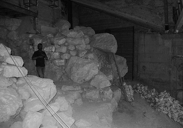 Рис. 44. Руины дворца, построенного Соломоном для царицы Савской Возле северной стены, окружающей ныне так называемый Старый Город в Иерусалиме, имеет вход в подземные каменоломни, которые считаются каменоломнями Соломона (см. Рис. 12-ц). Судя по всему, это изначально была естественная пещера, которую существенно увеличили в ходе выборки известняка для строительства на протяжении весьма длительного времени (отметились здесь даже тамплиеры). На стенках и потолке этой каменоломни сохранились вполне отчетливые следы вырубки каменных блоков простыми ручными инструментами. Однако размер этих блоков, если судить по оставленным следам, был вполне скромным. Равно как и размеры проходов между различными залами совершенно не приспособлены для перемещения через них огромных мегалитов. Впрочем, подземная каменоломня – вообще крайне неудобный способ добычи мегалитических блоков, для этого гораздо больше подходит открытый карьер. Так что утверждение, что именно здесь добывался материал для стены вокруг Храмовой горы, совершенно не соответствует особенностям каменоломни Соломона…