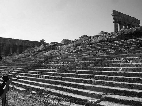 Рис. 68. Лестница между Алтарным двором и платформой храма Юпитера Размеры этих трех блоков, из которых сделан нижний ярус лестницы таков, что они вполне сопоставимы с… трилитонами на противоположной стороне храма Юпитера!.. Более того. Когда Мария Дудакова вычертила схему расположения мегалитических блоков, оказалось что уровень расположения блоков, образующих этот нижний ярус лестницы с восточной стороны храма Юпитера, отличается от уровня расположения трилитонов на западной стороне храма всего на семь сантиметров. Разница в семь сантиметров при длине храма Юпитера в сто метров уже ничтожна, но и она вполне может оказаться лишь следствием погрешности измерений!.. Все это приводит к заключению, что аналог трилитонов западной стены находился и на восточном крае платформы храма Юпитера. И, кстати, неизвестно, когда тут появились ступеньки. Их вполне могли высечь и римляне в ходе своей реконструкции комплекса. А до того тут вполне могла быть та же самая тройка трилитонов!.. Но трилитоны западной стены уложены на ряд мегалитов в полтонны весом. Таким образом вполне логично предположить, что и блоки нижнего яруса лестницы также уложены на ряд аналогичным мегалитов. Так ли это, могут показать лишь археологические раскопки, которые тут, увы, не проводились. Однако вполне возможно, что в ближайшее время такие исследования будут проведены. Ведь даже среди археологов начинает постепенно утверждаться версия, что платформа храма Юпитера имеет более древнее происхождение. По крайней мере эту идею продвигает уже ранее упоминавшийся немецкий археолог Даниэль Лохманн (Lohmann). И все движется к тому, что в ближайшие годы археологические исследования платформы будут возобновлены…