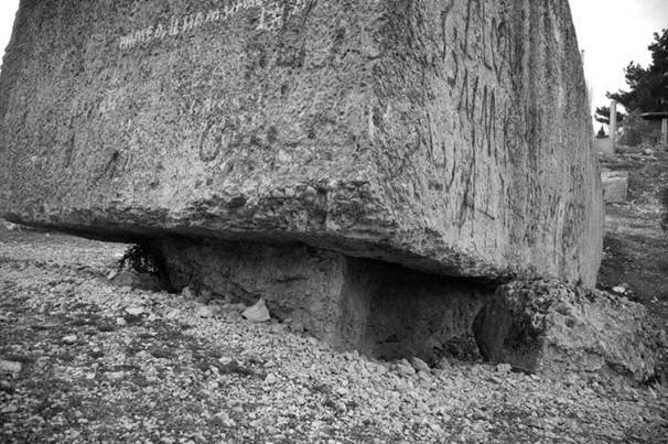 Рис. 73. Параллельные полосы на поверхности трилитонов Еще более любопытно, что место, где можно увидеть эти параллельные полосы, находится на несколько метров ниже уровня самой платформы храма Юпитера. Говоря другими словами, верхний край трилитонов располагается существенно ниже уровня платформы, что производит также впечатление некоего недостроя не только храма, но и самой платформы под ним. Только недостроя уже не римлянами, а самыми первыми строителями. Если ориентироваться на чисто визуальные ощущения, то мне показалось, что туда просто просится блок, оставшийся в каменоломне и известный под названием «Южный камень» (от древнего арабского названия «Гайяр эль-Кибли»). Его габариты как раз такие, что он замечательно встал бы на трилитоны, и его верхний край при этом оказался бы вровень с полом храма Юпитера. Но «Южный камень» остался в каменоломне. Его так оттуда и не вынули. И если он предназначался именно в то место кладки, которая должна была продолжиться выше трилитонов, то мы имеем дело со свидетельством недостроя вообще с самого начала. Вес этого блока оценивается примерно в полторы тысячи тонн!.. И когда стоишь рядом с ним или забираешься на него, испытываешь чувство чего-то запредельно нереального (см. Рис. 22-ц). Так и кажется, что этот блок собирались дальше нарезать как колбасу на отдельные части. Однако видя, какие блоки использовались в самом Баальбеке, понимаешь, что блок, оставшийся в каменоломне тоже собирались целиком использовать в строительстве. И у тех, кто его изготавливал, явно не было никаких сомнений в том, что эту громадину можно доставить в комплекс и поднять выше трилитонов…