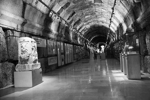 Рис. 76. Коридор под платформой Алтарного двора Арочный свод этих коридоров вполне соответствовал исходной версии историков о строительстве Баальбека во времена Римской империи, ведь арка долгое время считалась изобретением именно римлян, так что ни у кого даже мысли не возникло подвергнуть сомнению гипотезу римского происхождения коридоров под Алтарным двором. Так что даже и сейчас полукруглая форма свода нередко используется в качестве «аргумента» якобы в пользу строительства комплекса римлянами. Однако, во-первых, постепенно под давлением результатов самых различных исследований историки вынуждены были отказаться от утверждения, что арка – римское изобретение. На Ближнем Востоке и в Передней Азии обнаружены бесспорные свидетельства строительства тут арочных конструкций еще задолго до прихода сюда римлян. И сейчас уже все более укрепляет свои позиция версия того, что римляне просто использовали и тиражировали этот строительный прием, подсмотренный ими на завоеванных территориях. А во-вторых, сомнения в римском строительстве вызывают параметры как самих коридоров под алтарным двором, так и каменной кладки их стен. Размер коридоров таков, что по ним совершенно спокойно можно было бы пустить современную ветку метро со всеми сопутствующими коммуникациями. Что касается кладки, то по меньшей мере нижних три ряда (есть ли что ниже уровня пола, просто не видно) выделяются своей мегалитичностью, полностью соответствующей по размеру блоков и даже по фактуре материала нижнему ярусу кладки в основании, скажем, Гексагонального двора (см. ниже Рис. 62 и Рис. 17-ц). То есть той кладке, для которой имеются основания для соотнесения ее с высоко развитой цивилизацией древних богов. При этом мегалиты на верхнем (третьем видимом) уровне уже имеют форму, указывающую на арочный свод. Так что римляне вполне могли здесь заниматься лишь реставрацией сводов, а не их строительством. Общие размеры этих коридоров позволяют выдвинуть версию, что между мегазобором и северной стеной платформы храма Юпитера предполагалось создание чего-то подобного. Но тут внутреннее помещение просто не успели перекрыть. А есть ли подобный коридор на южной стороне храма Юпитера – неизвестно. Данных о каких либо раскопках в этой зоне, увы, нет…