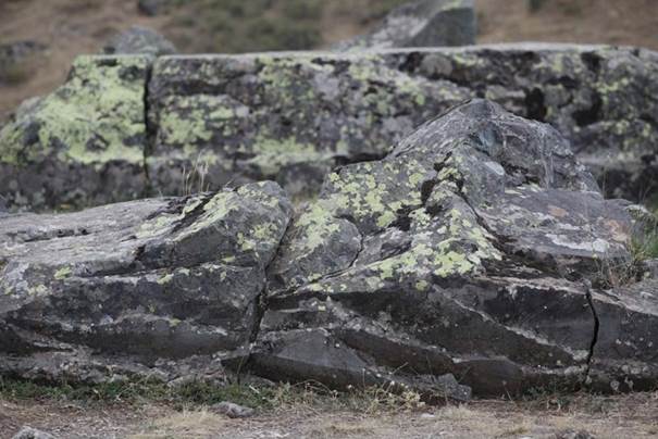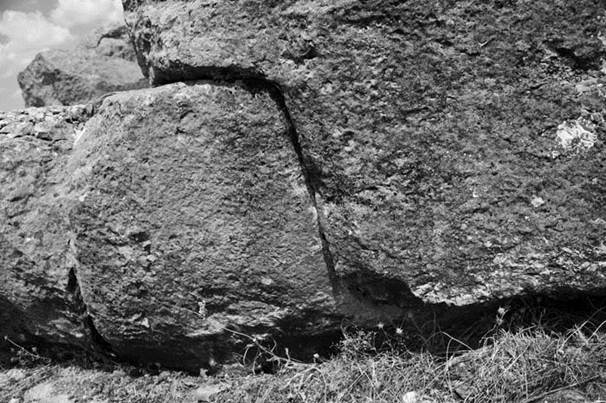 Зачем мастерам понадобилось так истерзать блок – не ясно. Единственная ближайшая аналогия, которая приходит в голову, это сравнение его с «пробным» куском канифоли, в который при пайке втыкают паяльник для проверки, насколько он нагрелся. Может быть, и здесь блок использовался лишь в качестве «пробного камня», на котором проверяли работу инструмента, и никакой смысловой нагрузки оставшиеся следы не несли... То, что это именно древний блок, сомнений не вызывает. Во-первых, он находится в кладке из таких же базальтовых блоков и покрыт множеством лишайников. А во-вторых, мы сейчас подобное можем сотворить только в ходе специальных работ на стационарном оборудовании камнеобрабатывающего комбината (да и то параметры следов будут менее технологичны). Довольно очевидно, что и у хеттов не было необходимого оборудования, и мы имеем дело со следами присутствия здесь цивилизации древних богов. Впрочем, на это же указывают и параметры окружающей кладки. И если на соседних блоках и нет столь явных следов машинной обработки, зато они состыкованы по всем правилам так называемой полигональной кладки, когда поверхность соприкосновения блоков меняется во всех трех измерениях и имеет порой весьма причудливую форму. Это особенно хорошо видно, где в результате землетрясений блоки чуть разошлись и дают возможность убедиться в том, что они плотно соединялись по всей своей толщине.