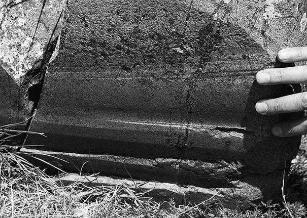 Рис. 96. Возможно, след тросовой пилы На ближнем торце блока явственно просматривались такие следы, которые обычно оставляет не очень хорошо натянутая тросовая пила. След уходит то глубже, то выше, однако при этом даже на «кривых» участках твердый базальт очень хорошо отшлифован. А при работе по базальту для этого требуется быстро движущийся стальной трос с алмазными насадками. На верхней весьма неровной поверхности блока осталась масса неглубоких надрезов, идущих в самых разных направлениях. Ширина этих надрезов везде не очень велика – буквально полтора-два миллиметра.