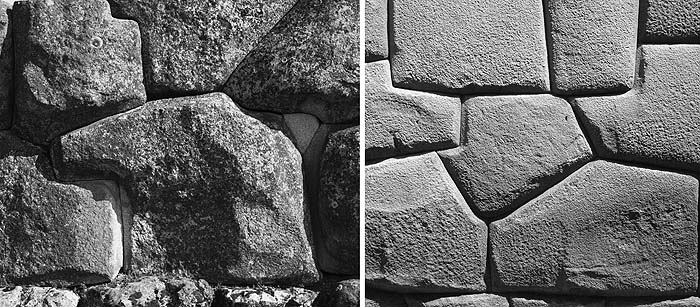 Многотонные блоки самой разнообразной причудливой формы тщательнейшим образом подогнаны друг другу по всей толщине стен (что хорошо просматривалось в местах разрушений). Внешняя сторона оставлена не выровненной, но при этом у каждого блока по периметру стыков снята небольшая фаска. Ближайший аналог – мегалитическая полигональная кладка в Куско, древней столице инкской империи.