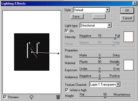Знову звернетеся filter > render > lighting effects і застосуєте наступні налаштування до шару з білим розмиттям.