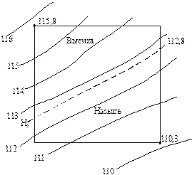 В нашем случае Построив на плане проектные горизонтали, для каждой вершины квадрата на глаз определяют ее проектную высоту и, вычитая из этой отметки фактическую высоту, находят рабочие отметки, то есть глубину выемки или высоту насыпи. Эти отметки подписывают возле вершин квадратов, затем проводят линию нулевых работ и методом призм или по формулам (125) вычисляют объемы насыпи и выемки.