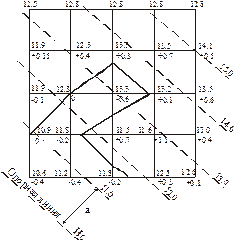 где H1, H2, H3, H4 – отметки точек, принадлежащих соответственно одному, двум, трем или четырем квадратам; n – общее число квадратов. После нахождения отметки H0 для каждой вершины квадрата подсчитывают рабочие отметки, характеризующие высоту насыпи или глубину выемки
