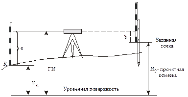 Рисунок 87 проектирование и расчет Вынос в натуру наклонной площадки осуществляют по маякам насыпи, которые выносят на проектные отметки. Линию нулевых работ закрепляют на местности промерами от вершин квадрата. Для выноса отметки на проектную высоту H0 нивелир устанавливают между точками с известной и заданной отметками. Взяв отсчет a по черной стороне рейки, стоящей на точке с известной отметкой, подсчитывают горизонт инструмента (Рисунок 88) Находят проектный отсчет b, при котором рейка встанет на заданную величину