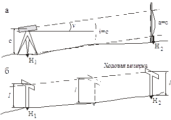 При дорожном строительстве часто возникает задача выноса в натуру линии с заданным уклоном i. Эту работу обычно выполняют с помощью параллельного визирного луча, направленного под заданным углом. Вынос в натуру некоторого отрезка этой линии можно сделать теодолитом, направив зрительную трубу под углом наклона . Можно вначале вынести в натуру конечные отметки этой линии H1 и H2 методом, рассмотренным выше.