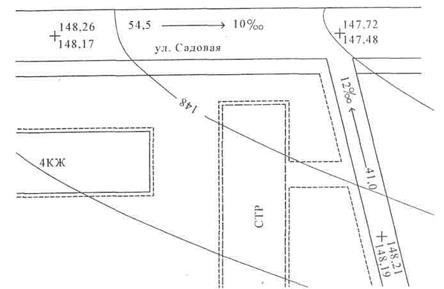 На городских территориях особое значение вертикальной планировки заключается в преобразовании рельефа городской территории с минимумом объемов земляных работ и полной совместимостью с рельефом существующей застройки. Рельеф должен обеспечивать нормальное функционирование городских коммуникаций и оптимальные параметры стока ливневых вод и канализации. Вертикальная планировка городской территории выполняется в два этапа. На первом этапе проектируются городские улицы и проезды. На рисунке 104 показан фрагмент схемы организации рельефа на застраиваемой территории.
