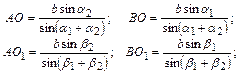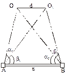 Если такой метод применить нельзя, то можно то же расстояние d определить из решения двух угловых засечек на концевые точки с некоторой базисной линии AB (Рисунок 108). Здесь по измеренным углам