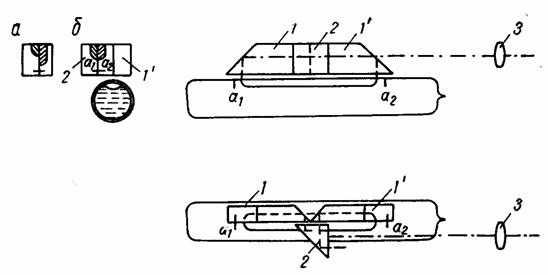 Рис.2.1.2. Контактний рівень з призмовою системою: а) поділ рівня на дві частини; б) приведення половинок рівня в контакт Перед тим, як зняти відлік з рейки повертають в ту чи іншу сторону елеваційний гвинт і добиваються суміщення його кінців (приводять в контакт рис.2.1.2, б). Завдяки цьому візирна вісь зорової труби приводиться в горизонтальне положення. Після цього спостерігач знімає відліки з рейки. Нівелір Н-3 є малогабаритним і вагою 2 кг без футляра (рис.2.1.1, а). Він має закріпний гвинт 5 і мікрометерний гвинт 6 та круглий рівень 1 для приведення його в робоче положення.