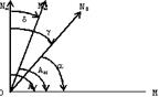 Рис.8.1. Ориентирование линии ОМ на местности Угол d, отсчитываемый от северного направления истинного меридиана N до магнитного меридиана Nм, называется склонением магнитной стрелки. Склонение северного конца магнитной стрелки к западу называют западным и считают отрицательным -d, к востоку - восточным и положительным +d. Угол g между северными направлениями истинного N и параллелью осевого Nо меридианов называется зональным сближением меридианов. Если параллель осевого меридиана расположена восточнее истинного меридиана, то сближение называется восточным и имеет знак плюс. Если сближение меридианов западное, то его принимают со знаком минус. Если известны долготы меридианов, проходящих через точки А и В, то сближение меридианов можно найти по приближенной формуле: g = Dl sin j, (8) где Dl- разность долгот меридианов, проходящих через точки А и В. Из формулы (8) следует, что на экваторе (j=0) сближение меридианов g= 0, а на полюсе (j=90) g = Dl.