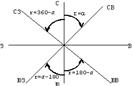 Рис.8.2. Зависимость между дирекционными углами и румбами Румб - горизонтальный острый угол отсчитываемый от ближайшего северного или южного направления меридиана до ориентируемого направления. Румбы имеют названия в соответствии с названием четверти, в которой находится линия, т.е.: северо-восточные СВ, северо-западные СЗ, юго-западные ЮЗ, юго-восточные ЮВ. На рис. 8.2 показаны румбы линий О-СВ, О-ЮВ, О-ЮЗ, О-СЗ и зависимость между дирекционными углами и румбами этих линий.