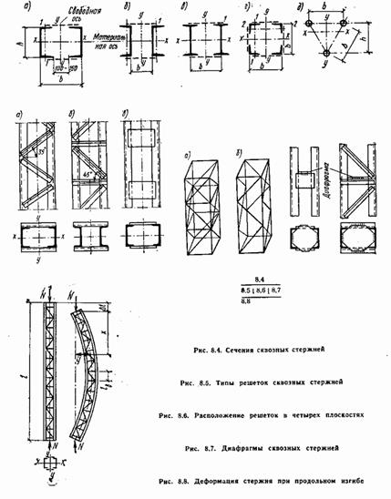 Простыми, но ограниченными по площади и менее экономичными по расходу стали получаются колонны из трех прокатных профилей (рис. 8.2, е) Весьма рациональны колонны трубчатого сечения (рис. 8.3, a) с радиусом инерции i=0,35dCP, где dCP - диаметр окружности по оси листа, образующего колонну. Сварка дает возможность получить колонны замкнутого сечения и других типов, например из двух швеллеров (рис 8.3, б) котороe при больших нагрузках могут быть усилены листами (рис. 8.3, в), или из уголков (рис. 83,г). Весьма экономичное сечение легкой колонны может быть получено из тонкостенных гнуто-сварных профилей (рис. 8.3 д). Преимуществами колонн замкнутого сечения являются равноустойчивость, компактность и хороший внешний вид; к недостаткам относится недоступность внутренней полости для окраски Чтобы избежать коррозии, такие колонны должны быть защищены от проникания внутрь влаги. При заполнении стальной трубы бетоном получается эффективная комплексная конструкция (трубобетонная), в которой труба является оболочкой, стесняющей поперечные деформации заключенного внутри бетонного цилиндра. В этих условиях работы прочность бетона на сжатие значительно увеличивается, исключаются потери местной устойчивости трубы и коррозии внутренней ее поверхности. Рационально применять тонкостенные трубы (толщина стенки 1/50 - 1/150 от диаметра трубы), но по условиям эксплуатации и возможности прикрепления примыкающих элементов к трубе они должны быть не тоньше 3 - 4 мм. В трубобетонном стержне бетон работает в основном на сжатие, а труба - на поперечное растяжение. Трубы могут быть как из малоуглеродистой, так и из низколегированной стали, бетон применяют высоких марок - от 250 до 500 и выше. Стержень сквозной центрально-сжатой колонны обычно состоит ив двух ветвей (швеллеров или двутавров), связанных между собой peшетками (рис. 8.4, а - в). Ось, пересекающая ветви, называется материальной; ось, параллельная ветвям, называется свободной. Расстояние между ветвями устанавливается из условия равноустойчивости стержня. Швеллеры в сварных колоннах выгоднее ставить полками внутрь (рис. 8.4, а), так как в этом случае решетки получаются меньшей щирины и лучше используется габарит колонны. Более мощные колонны могут иметь ветви из прокатных или сварных двутавров (рис. 8.4 в). В сквозных колоннах из двух ветвей необходима обеспечивать зазор между полками ветвей (100 - 150 мм) для возможности окраски внутренних поверхностей. Стержни большой длины, несущие небольшие нагрузки, должны иметь для обеспечения необходимой жесткости развитое сечение, поэтому их рационально проектировать из четырех уголков, соединенных решетками в четырех плоскостях (рис. 8.4, г). Такие стержни при небольшой площади сечения обладают значительной жесткостью, однако трудоемкость их изготовления больше трудоемкости изготовления двухветвевых стержней. При трубчатом сечении ветвей возможны трехгранные стержни (рис. 8.4, д), достаточно жесткие и экономичные по затрате металла. Решетки обеспечивают совместную работу ветвей стержня колонны и существенно влияют на устойчивость колонны в целом и ее ветвей. Применяются решетки разнообразных систем: из раскосов (рис. 8.5, а), из раскосов и распорок (рис. 8.5, б) и безраскосного типа в виде планок (рис. 8.5, в). В случае расположения решеток в четырех плоскостях (рис. 8.4, г) возможны обычная сх