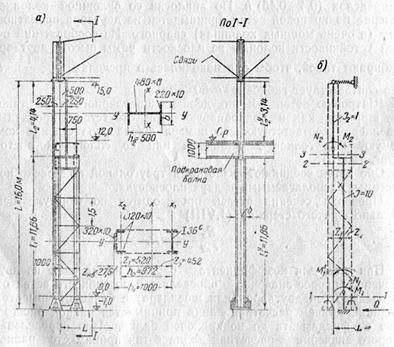 Шатровую ветвь обычно делают швеллерного типа такой же ширины, как и подкрановую. При отсутствии прокатных швеллеров соответствующего номера швеллерное сечение компонуют из уголков с планками или со сплошным листом. Обе ветви соединяют решетками треугольной или раскосной системы, располагаемыми в двух плоскостях. Проверка сечения ветвей производится по