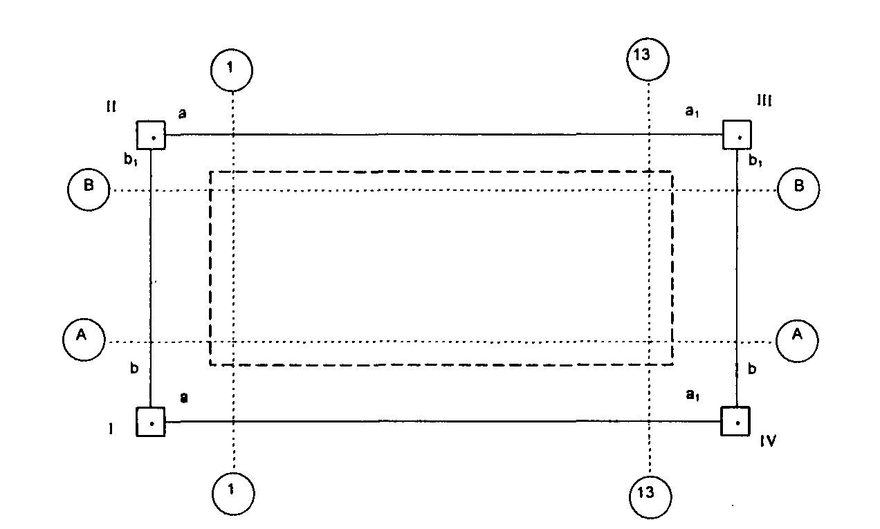 Схема перенесения в натуру осей здания от строительной сетки способом створной засечки По сторонам сетки I-IV и –II-III откладывают отрезки, равные проектному размеру а, а1, и по полученным точкам с помощью теодолита строят створ осей 1-1 и 13-13. По сторонам I-II и IV-III откладывают отрезки b, b1 и по полученным точкам строят створ осей А-А и В-В. Пересечение осей дает точку углов здания. Указанными выше способами можно производить разбивку зданий и сооружений на застроенных участках от местных предметов (например существующих зданий). Так как точность разбивки от местных предметов сравнительно небольшая, то геодезическая подготовка данных осуществляется графическим методом по плану крупного масштаба. Date: 2015-09-19; view: 1907; Нарушение авторских прав |