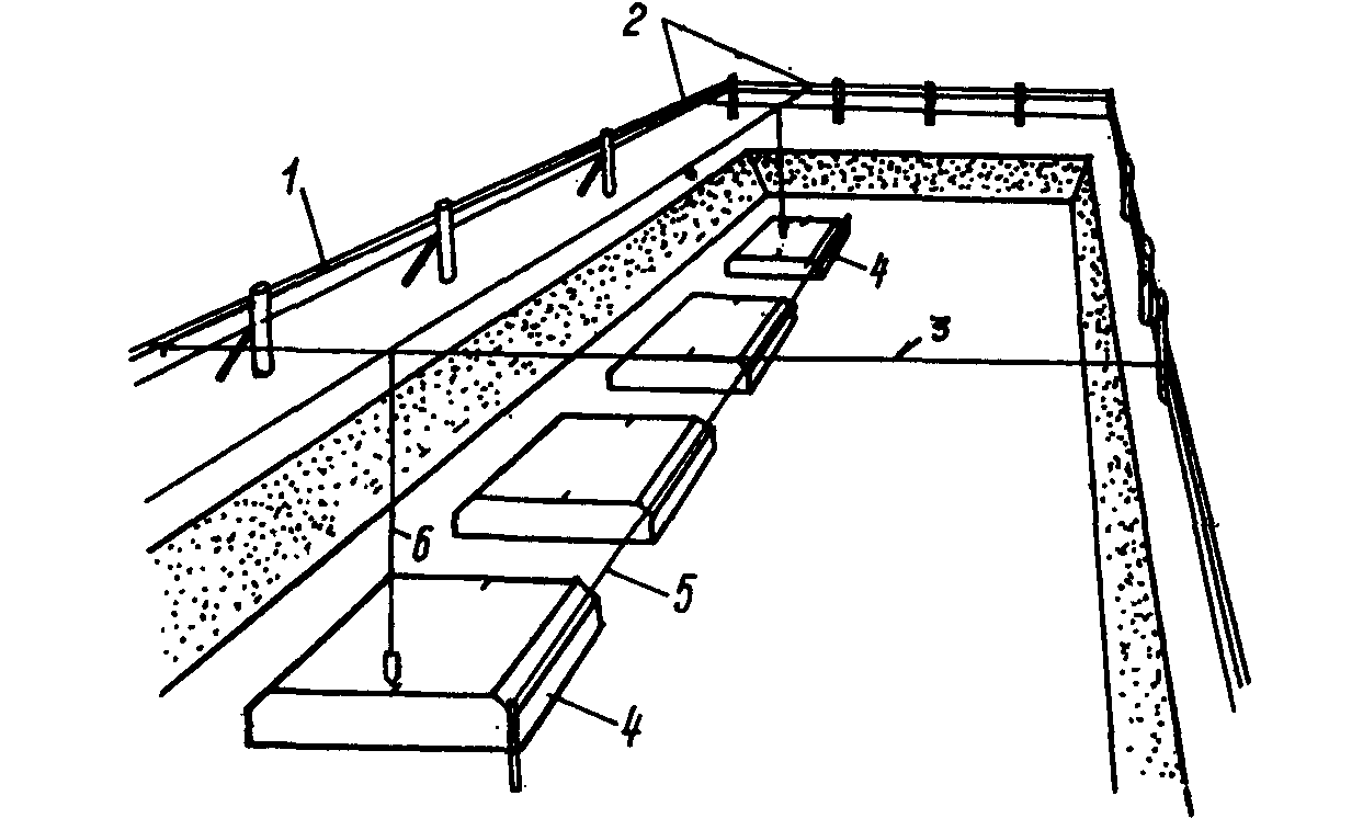 Схема перенесения разбивочных осей в котлован отвесами: 1 - обноска; 2 - риски осей; 3 - осевая проволока; 4 - маячные блоки; 5 - причалка; 6 - отвес В котловане оси закрепляют временными знаками на дне или на откосах. Передачу высот в котлован производят нивелиром непосредственно на дно или по откосам. В глубокие котлованы отметки передают с помощью подвешенной рулетки и двух нивелиров.