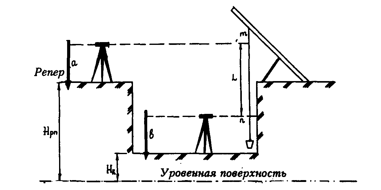 Из рис. видно, что отметка дна котлована Нк = Hрп + а - L - в, где Нрп - отметка репера; L — длина ленты между линиями визирования нивелиров: L = m-n
