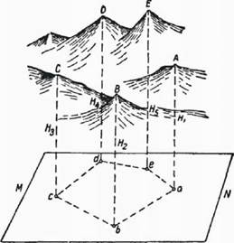Рис. 4 Если изображаемый участок физической земной поверхности невелик (в пределах площади круга диаметром не более 20 км), то соответствующую ему часть воображаемой уровенной поверхности МК (см. рис. 2) можно принять за горизонтальную плоскость. В таком случае точки земной поверхности, например А, В, С, Б, Е (рис. 4), проектируют на воображаемую горизонтальную плоскость МК перпендикулярами: Аа, ВЬ,...., Ее. Если проектируемые точки принять за вершины многоугольника, то плоская фигура аЬЫе представит горизонтальную проекцию фигуры АВСБЕ местности. Очевидно, горизонтальная проекция аЬсёе не будет подобна фигуре местности АВСБЕ. Она будет подобна ей лишь в том случае, если все точки данного контура местности лежат в одной плоскости, параллельной плоскости МИ. Для получения изображения на плоскости криволинейного контура местности надо найти горизонтальные проекции характерных его точек, настолько близких между собой, чтобы элементы кривой можно было считать прямыми. Тогда соответствующая кривая в плоскости МИ будет горизонтальной проекцией криволинейного контура местности. Глава III. ПЛАН И КАРТА План местности. Профиль При помощи геометрических построений горизонтальные проекции контуров местности можно нанести на бумагу в уменьшенном и подобном виде. Изображение в уменьшенном и подобном виде горизонтальных проекций контуров местности называется планом. Обращаясь к рис.2 и 4, легко видеть, что одной горизонтальной проекции точек а, Ь, с, й, е недостаточно для полного представления о взаимном расположении их на местности; надо еще знать относительно уровенной поверхности высоты этих точек Н1=Аа, Н2=ВЪ и т. д. Однако, если на плане у соответствующих проекций надписать их отметки, то такой план будет недостаточно нагляден, так как довольно трудно представить себе одновременно все точки плана расположенными на высотах, соответствующих этим числам. Отмеченный недостаток устраняется при помощи особого условного способа выражения формы земной поверхности (рельефа) кривыми равных высот, называемыми горизонталями или изогипсами. По форме и взаимному расположению этих кривых можно судить о рельефе местности. При изображении рельефа дна водоемов и водотоков (озер, прудов, рек и т. п.) на планах проводят иногда кривые равных глубин, называемые изобатами. Имея план с изображением на нем рельефа горизонталями или просто план с надписанными на нем отметками, можно составить изображение вертикального разреза местности по некоторому заданному направлению. Такое изображение называется профилем.